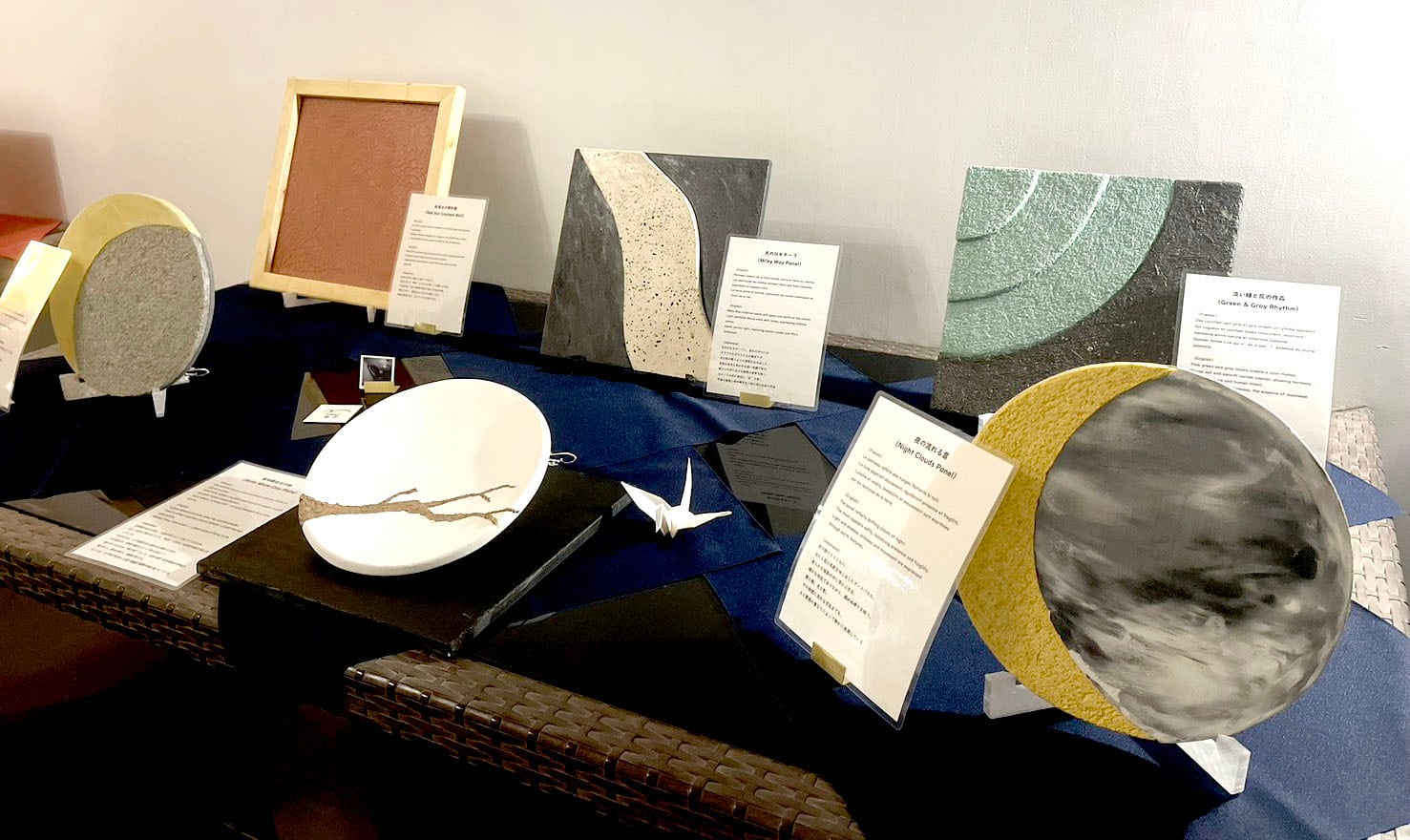 左官アートパネル 300mm × 300mm 夜の流れる雲(Night Clouds Panel) Japanese: 夜の静けさとともに、 流れる雲の気配を映し出したアートパネル。 柔らかな陰影の中に浮かぶ月は、 確かな存在でありながら、掴めぬ儚さを持つ。 静と動、光と影。 その狭間に流れる空気までも、 土と質感の重なりによって静かに表現している English: The panel reflects drifting clouds at night. The moon appears softly, balancing presence and fragility. Light and shadow, stillness and movement are expressed through earth textures. French: Le panneau reflète des nuages flottants la nuit. La lune apparaît doucement, équilibrant présence et fragilité. Lumière et ombre, immobilité et mouvement sont exprimées par les textures de la terre.